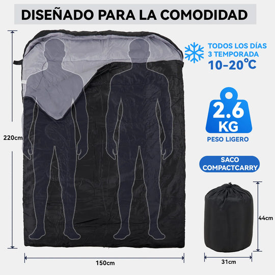 Saco De Dormir Dos Plazas Doble 10℃-20℃ 2600g Recto negro Con Gorro