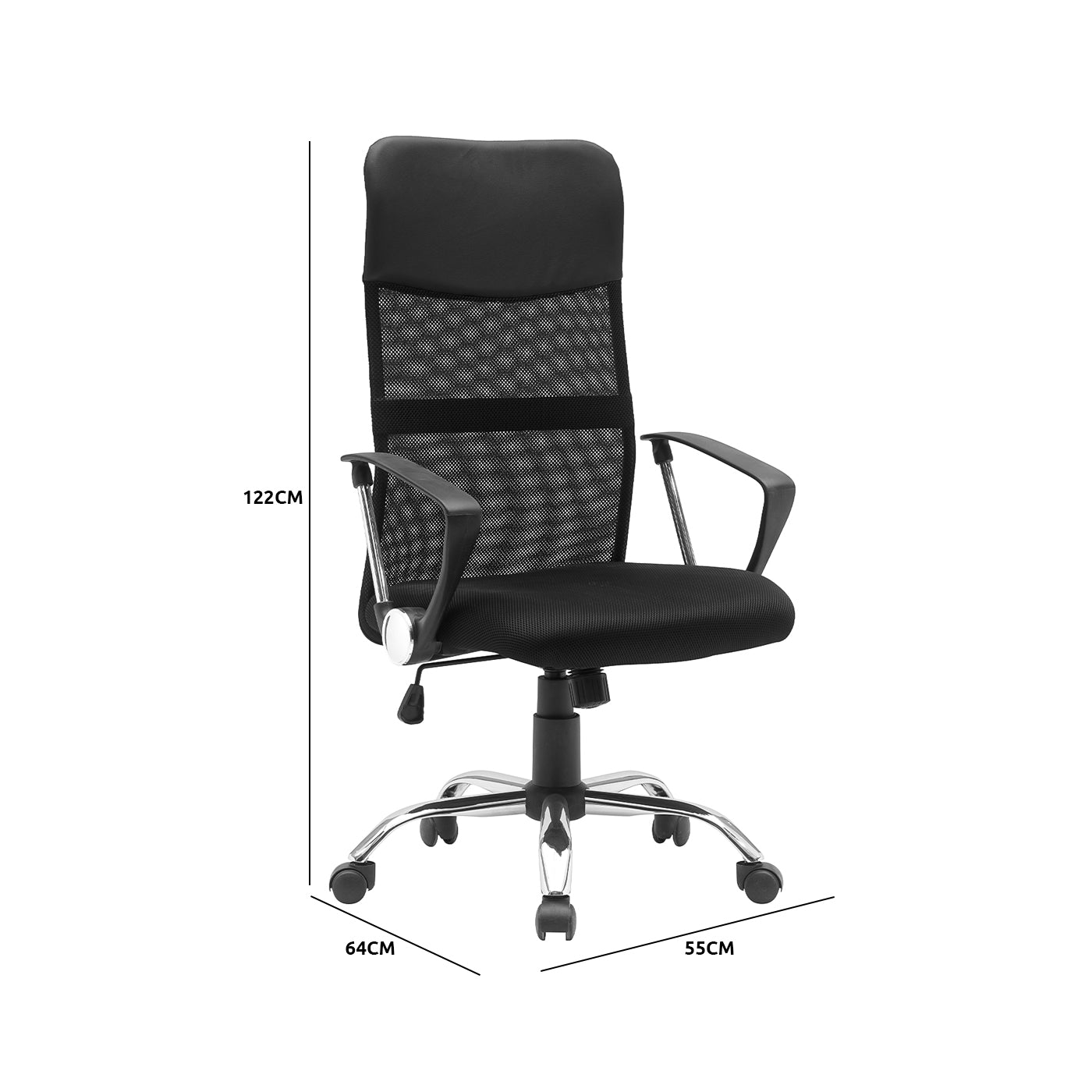 La silla de oficina Emilio está diseñada para ofrecerte comodidad y resistencia con materiales de alta calidad y un diseño ergonómico que se adapta a tu cuerpo. Su respaldo alto y curvado proporciona soporte ideal para largas jornadas, mientras que la malla transpirable y el cojín de espuma de alta densidad aseguran frescura y confort. Cuenta con reposabrazos fijos para mayor estabilidad y ruedas giratorias que facilitan el movimiento. Fácil de armar en 10-15 minutos, su altura ajustable entre 47 y 57 cm se adapta a tus necesidades, soportando hasta 100 kg con total confianza.