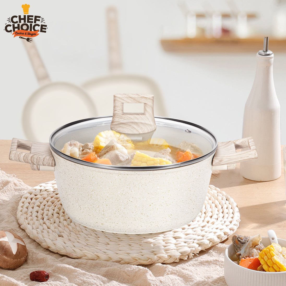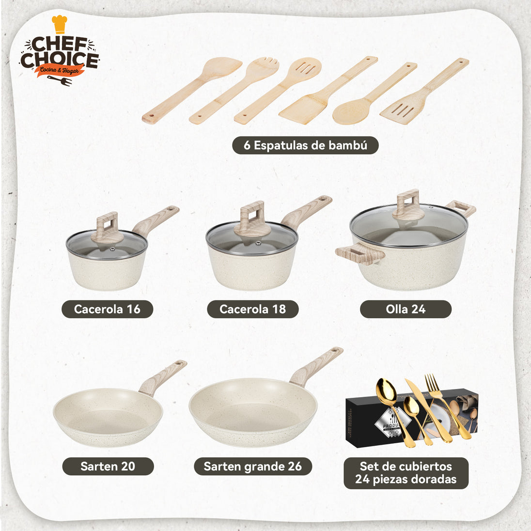 Transforma tu experiencia culinaria con esta completa batería de cocina de 38 piezas. Fabricada en aluminio resistente con revestimiento antiadherente tipo granito, ofrece una distribución uniforme del calor para resultados perfectos en cada preparación. El elegante acabado blanco crema se adapta a cualquier estilo de cocina. Este conjunto incluye todo lo necesario: ollas, sartenes, tapas y utensilios complementarios. Fácil de limpiar y mantener, garantiza durabilidad y rendimiento excepcional. La solución ideal para cocinas modernas que buscan calidad, funcionalidad y diseño en una sola inversión.
