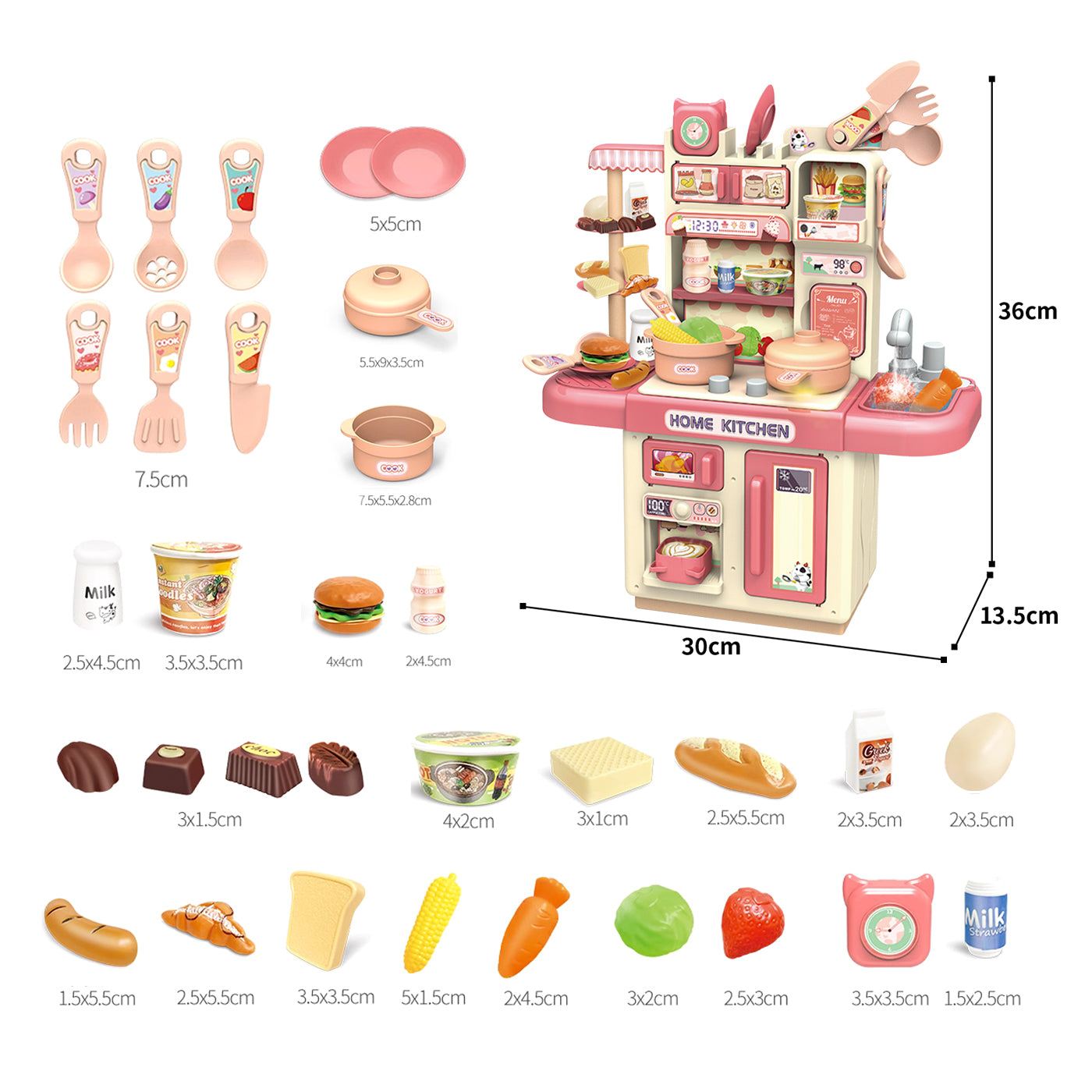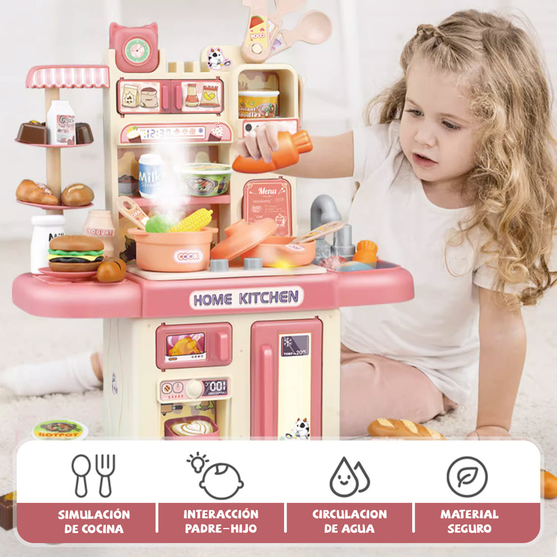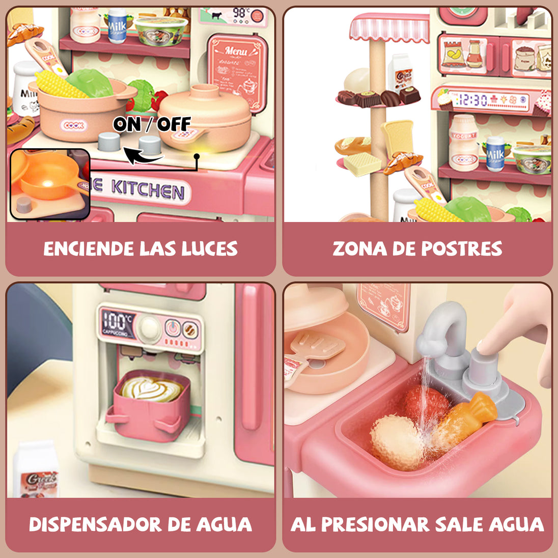 Este set de cocina de juguete de 32 piezas en color rosado mide 30 cm de largo, 13.5 cm de ancho y 36 cm de alto, y funciona con 3 pilas AA (no incluidas). Incluye una estufa electrónica con luz simulando el fuego, un fregadero con sistema de circulación de agua para lavar platos y alimentos de juguete, además de espacios para organizar todos los accesorios. Perfecto para que los niños aprendan sobre cocina y cuidado del agua mientras se divierten. Presentado en una atractiva caja, es el regalo ideal para cumpleaños, Navidad o el Día del Niño.