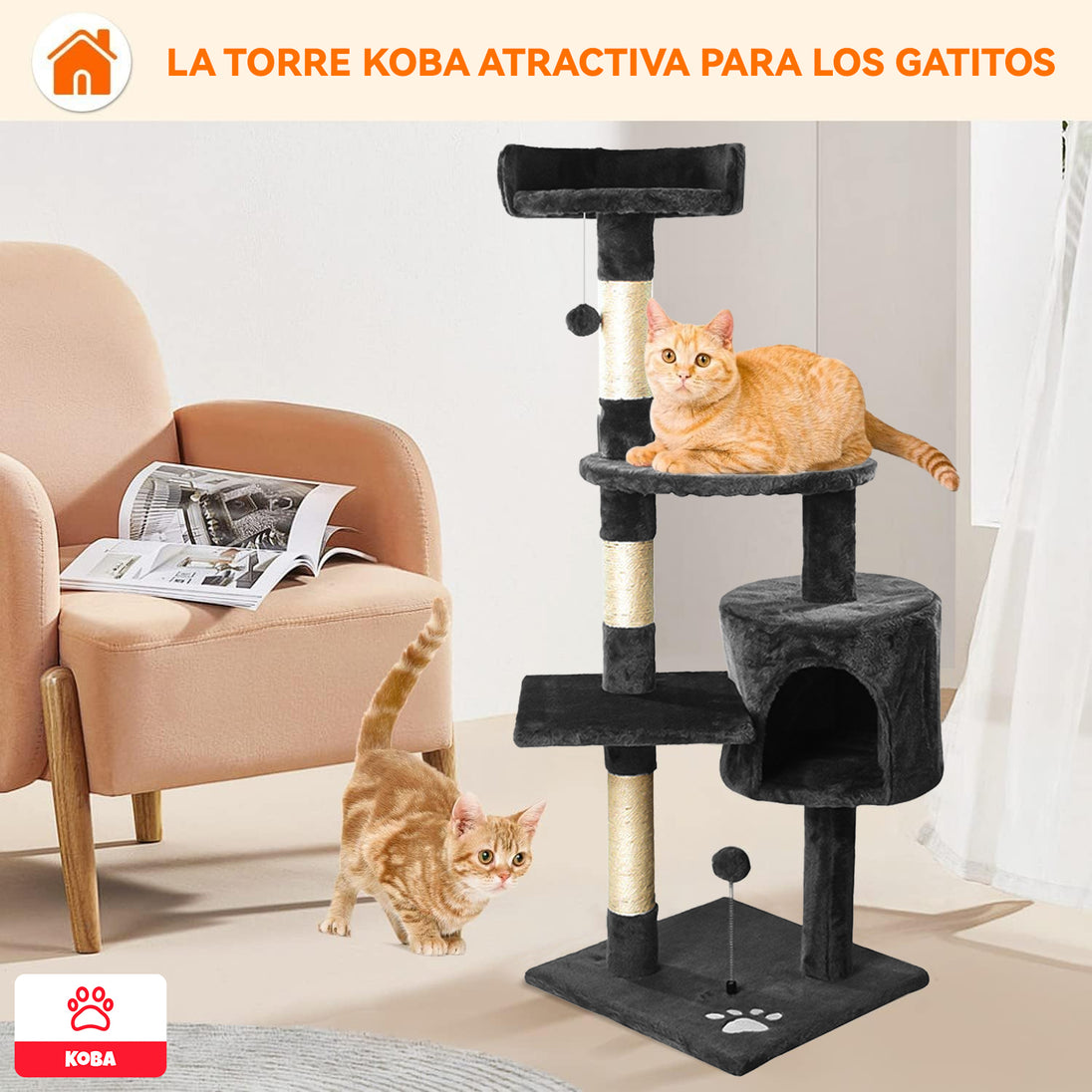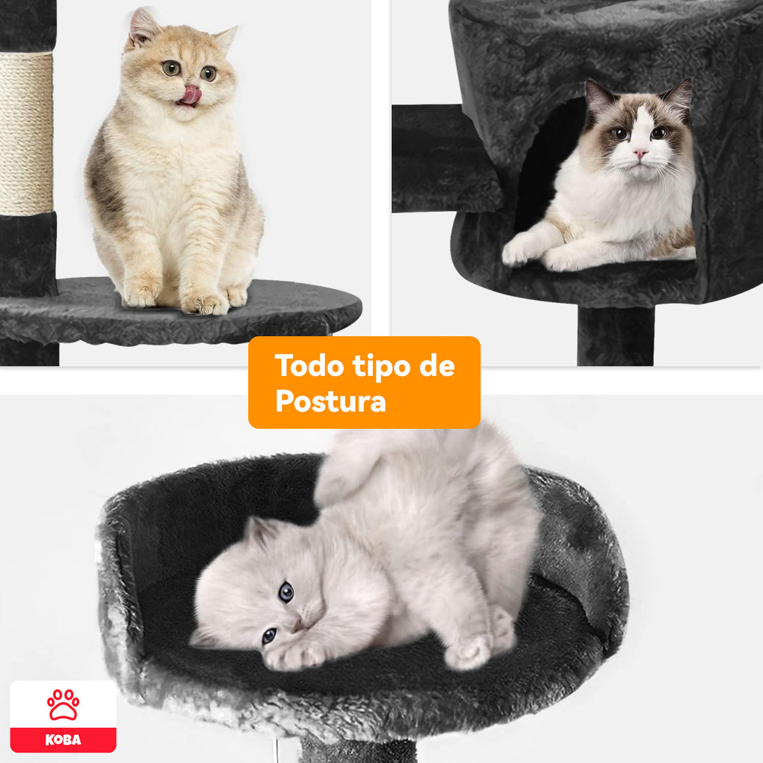 Este árbol para gatos combina múltiples funciones: es un espacio para trepar, un cómodo lugar para dormir, un área de juegos y un refugio acogedor. Sus postes recubiertos de yute natural ofrecen el lugar perfecto para que tu gato rasque y estire, protegiendo tus muebles y cortinas. Además, la plataforma superior suave brinda un rincón ideal para que tu gato se relaje y descanse en cualquier momento. Una solución completa para mantener a tu gato feliz y tu hogar protegido.