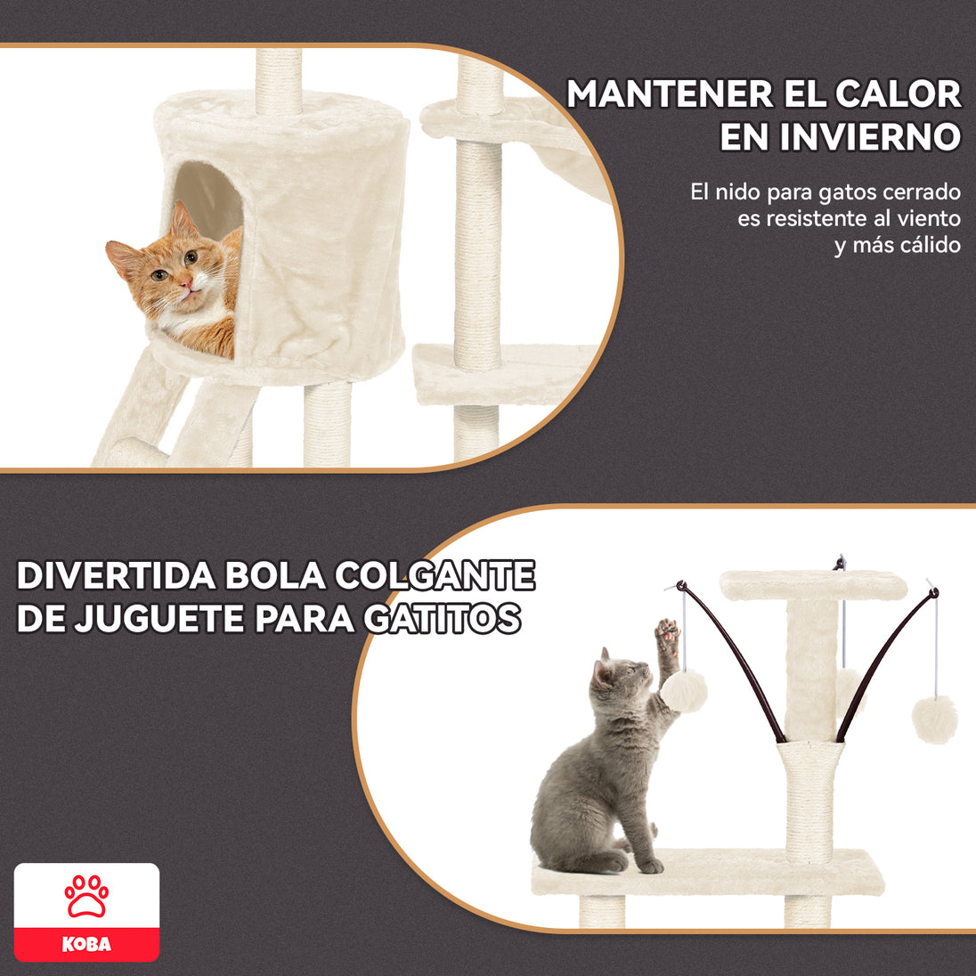 Descubre la Torre Rascador Árbol para Gatos de estilo clásico, una solución multifuncional de 138 cm que ofrece diversión y descanso para tu michi. Con un diseño elegante en color crema blanca, esta torre cuenta con una base estable de 48x35 cm y está fabricada con materiales premium y seguros. Incluye poste de yute, pompones colgantes, cueva espaciosa, plataformas para relajarse, escalera y una hamaca ultrasuave. Fácil de armar en menos de 30 minutos, es ideal para hogares con varios gatos, promoviendo su bienestar y habilidades motoras mientras protege tus muebles.