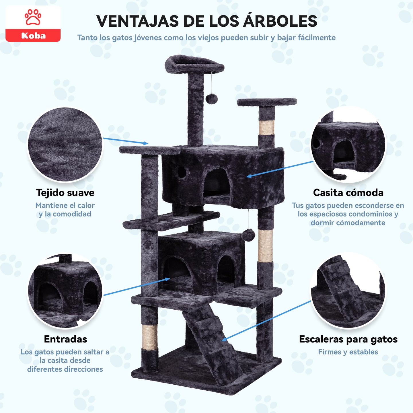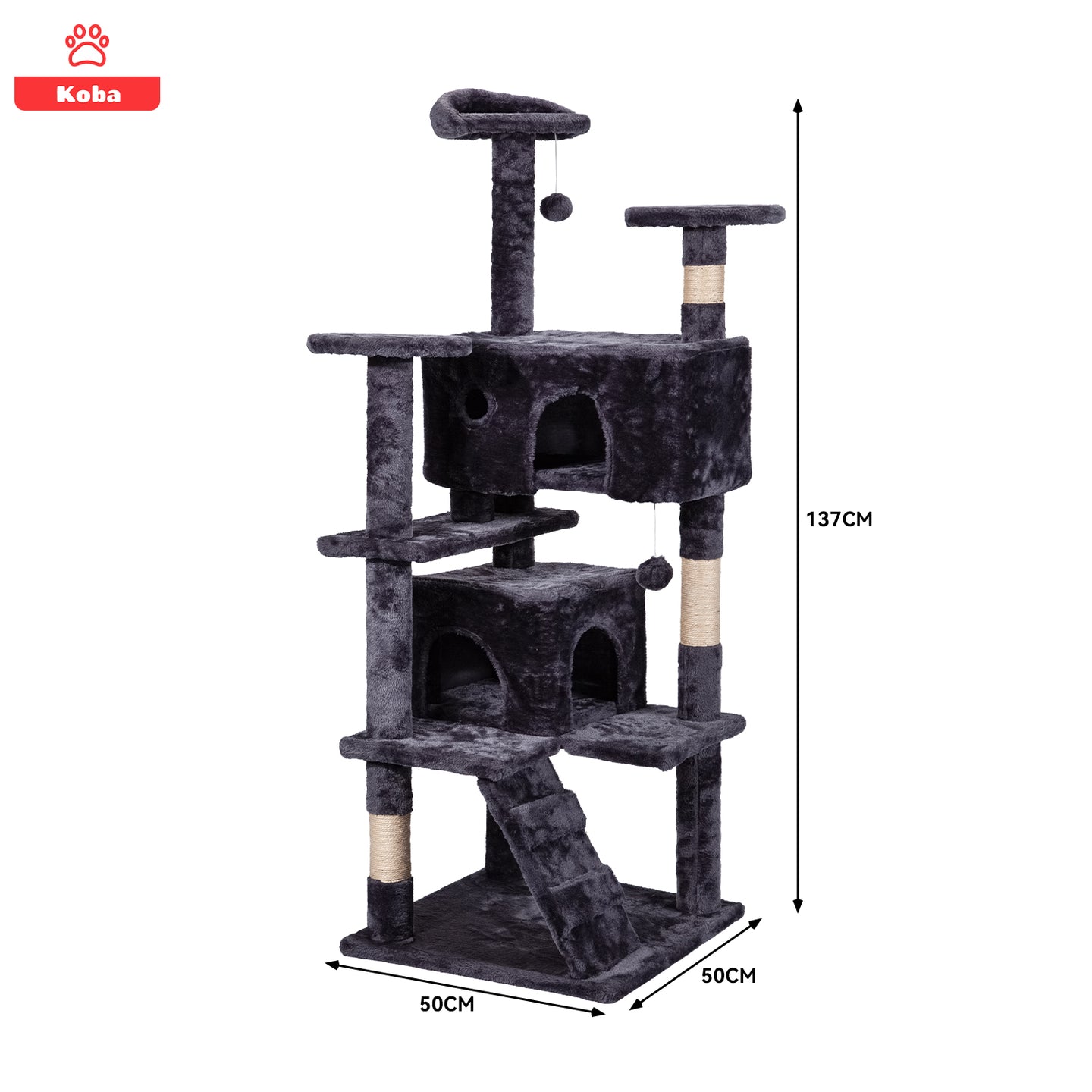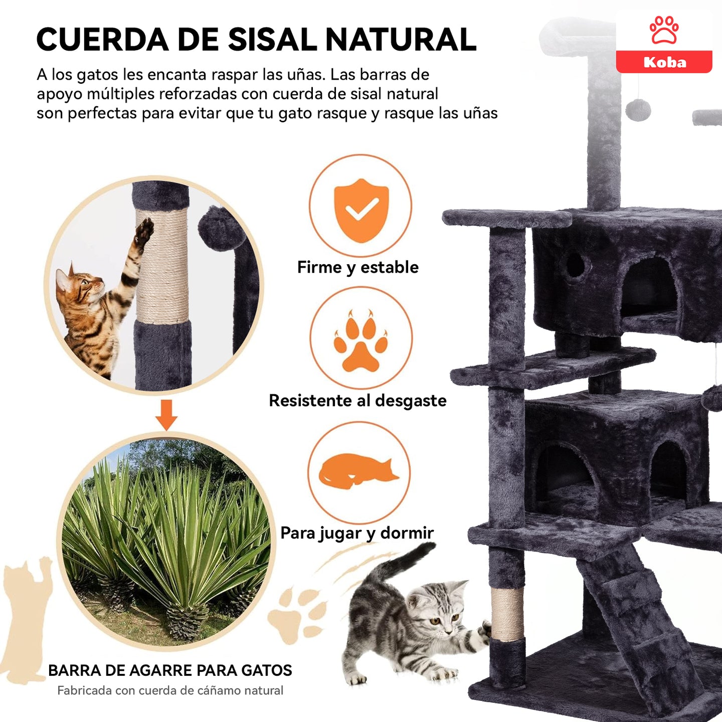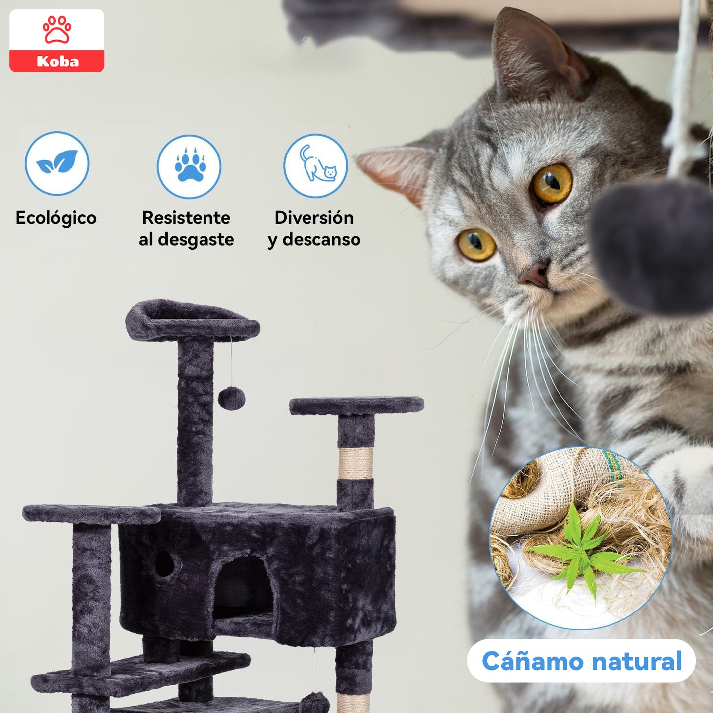 El rascador torre KOBA para gatos, con un diseño elegante en color marengo, mide 137 cm de altura y cuenta con una base de 50x50 cm. Fácil de armar en menos de 30 minutos, ofrece múltiples funciones: postes de yute para rascar, rampas, casitas acogedoras, plataformas para descansar y pelotas colgantes para jugar. Su estructura estable y resistente soporta hasta 3 gatos de 8 kg cada uno, brindando un espacio seguro y divertido. Cubierto con tela suave y materiales de calidad, es ideal para mantener a tus michis activos y proteger tus muebles.