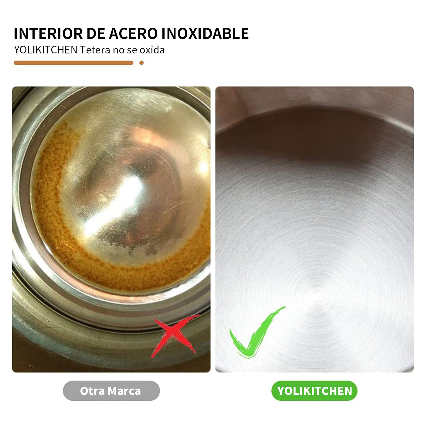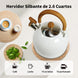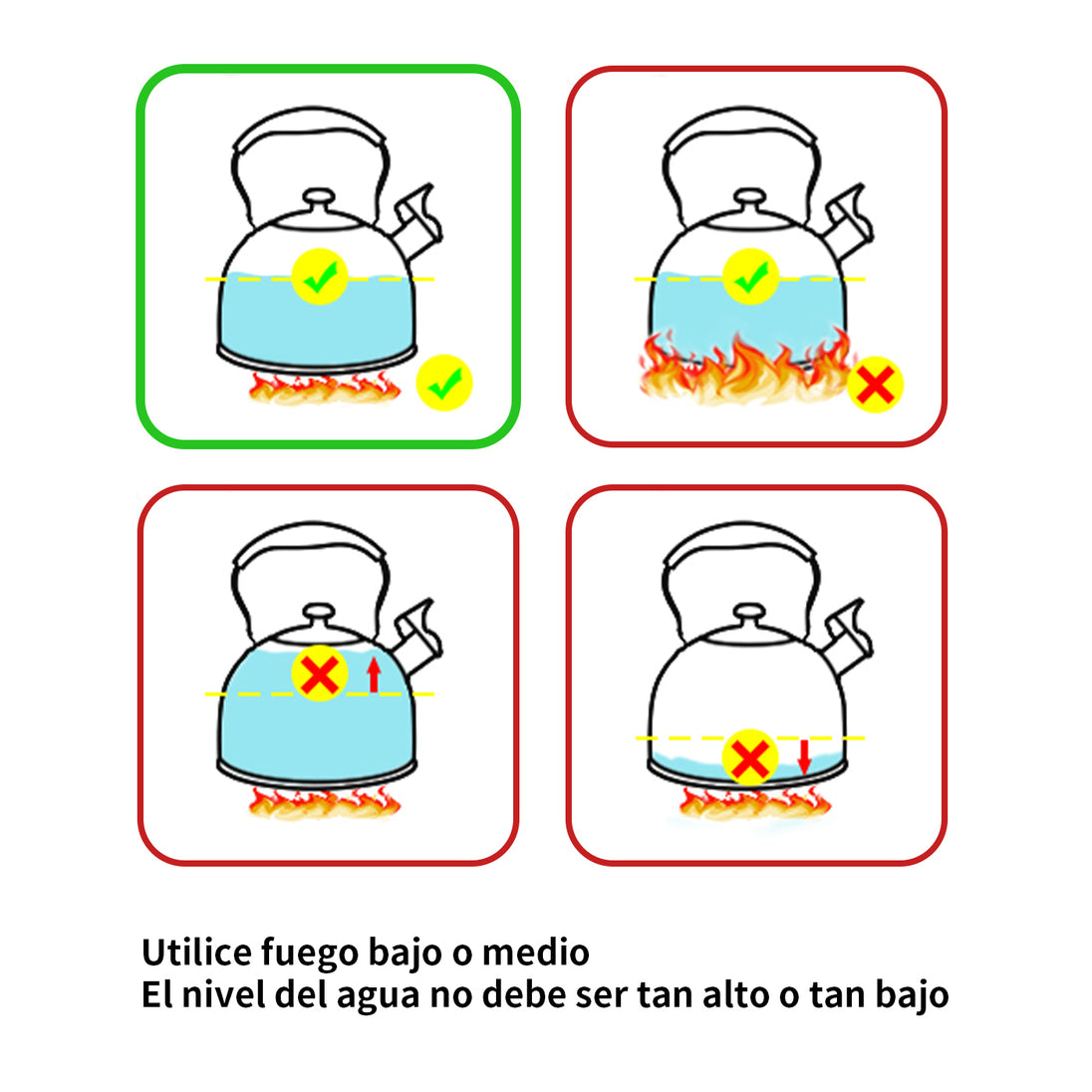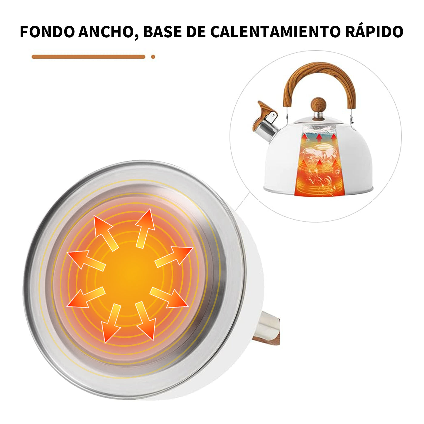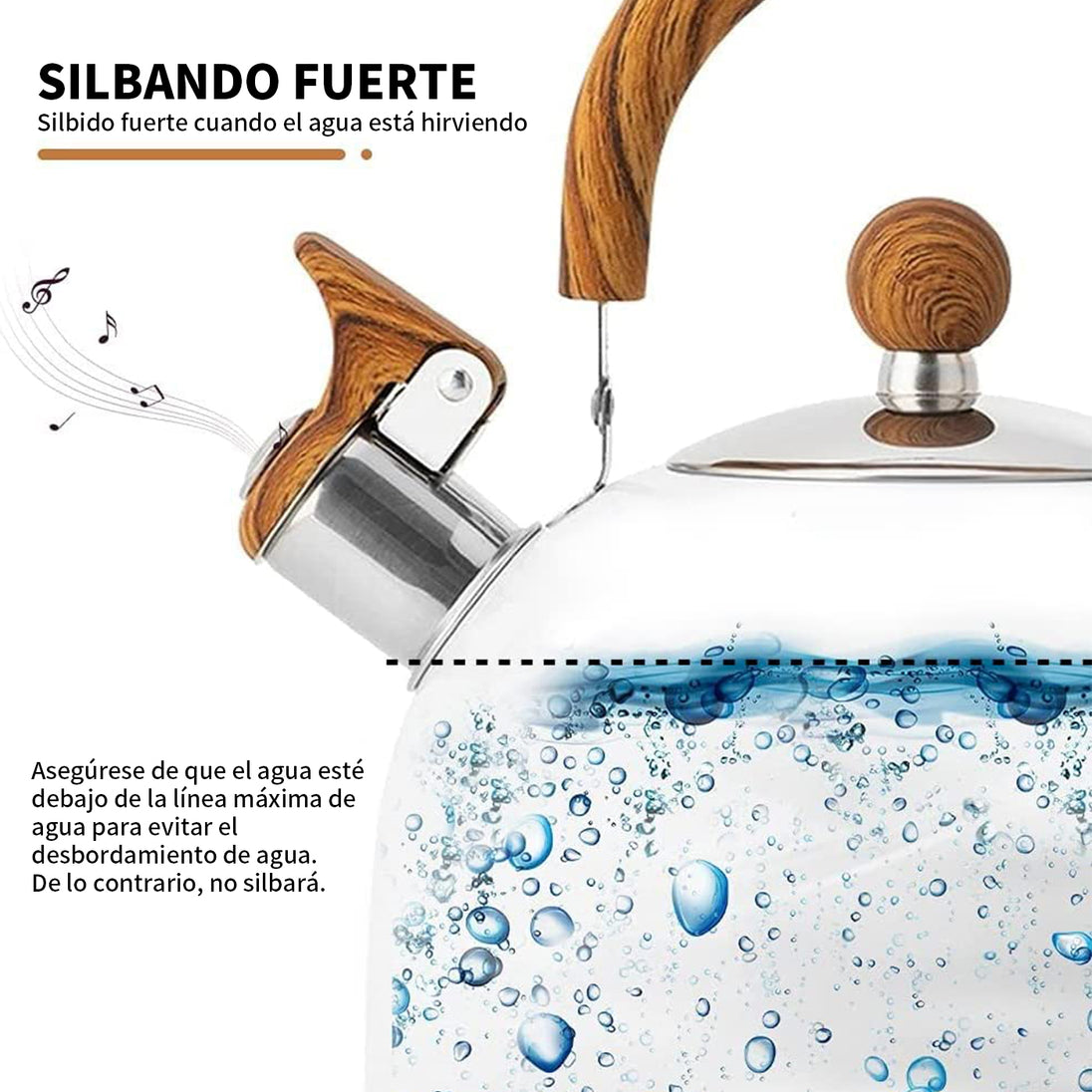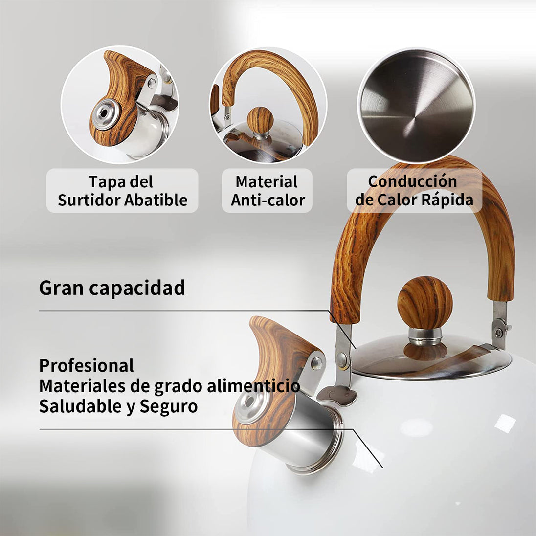 Esta tetera de acero inoxidable de grado alimenticio ofrece un calentamiento rápido y seguro, garantizando agua limpia y saludable. Su silbido potente te avisará claramente cuando el agua esté lista, incluso en ambientes ruidosos, para que puedas disfrutar sin preocupaciones. Con una capacidad de 2.5 litros, permite hervir suficiente agua de una sola vez, ahorrando tiempo. El mango ergonómico de baquelita con acabado en madera facilita un agarre cómodo y seguro, mientras que el práctico botón de apertura y cierre hace que verter el agua sea sencillo y seguro. Ideal para tu cocina diaria.