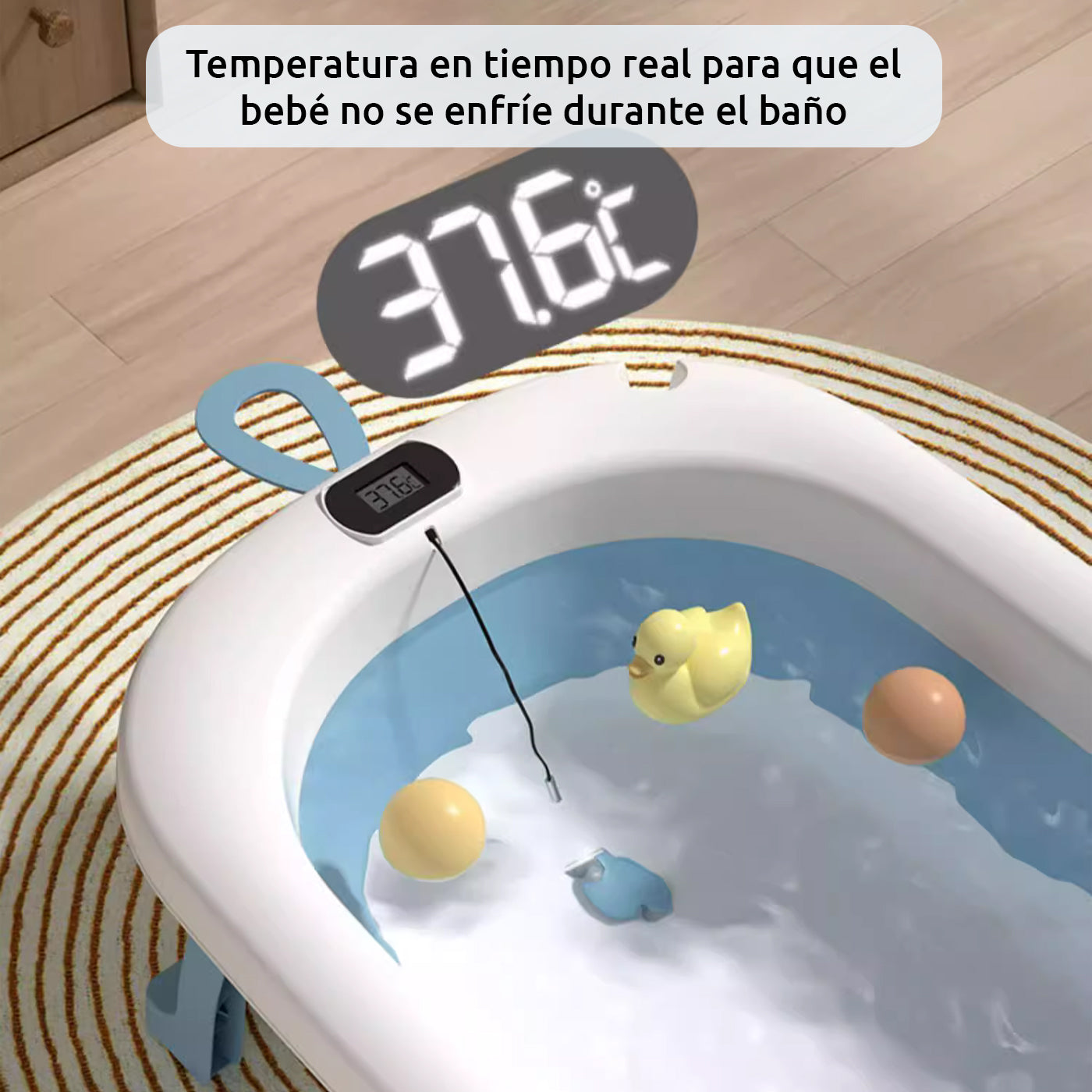 La tina plegable para bebé ANIKIDS incluye un termómetro integrado que asegura la temperatura ideal del agua, eliminando preocupaciones por el frío o calor. Viene con un cojín ergonómico y suave, cubierto de algodón, para un baño más cómodo. Su base antideslizante de silicona ofrece seguridad y estabilidad, evitando accidentes. Diseñada para bebés desde recién nacidos hasta 3 años, su formato compacto y plegable facilita el almacenamiento y secado. Fabricada con materiales duraderos y seguros (PP+TPE), es fácil de usar y limpiar, perfecta para el cuidado diario de tu pequeño.